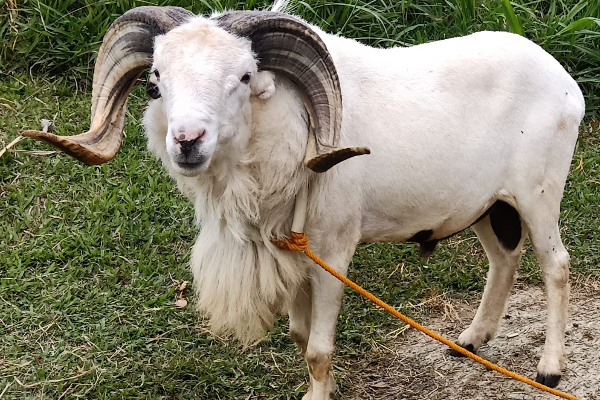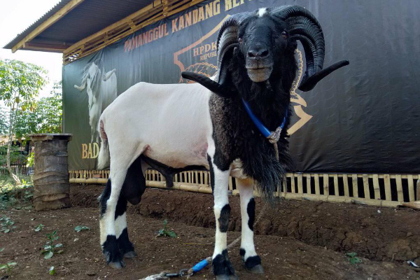 It differs from the common thin-tailed sheep in its larger size, convex facial profile, high frequency of the earless gene, variety of colour and by the presence of a throat ruff or mane and a distinct deposit of fat at the base of the tail.The colour is extremely varied; Black, black with little white (on tail, feet, poll), black-and-white pied, white with little black (on face, feet, rump), grey or grey-and-white, tan or tan-and-white. The horns of the Rams are heavy with pronounced cross ridges and sharp angles, Priangan ewes are polled.